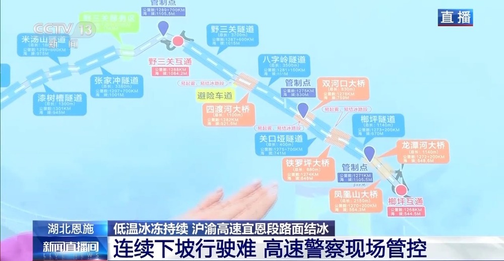 沪渝高速是我国连接东西方向的大动脉,常年车流量非常大,尤其是大货车居多。沪渝高速宜恩段这一段地处山区,桥隧比超过了60%。因此,这个区域如果出现冰冻雨雪天气,桥面的积雪遇到山中的大风,就非常容易结冰,对车辆行驶带来安全隐患。
