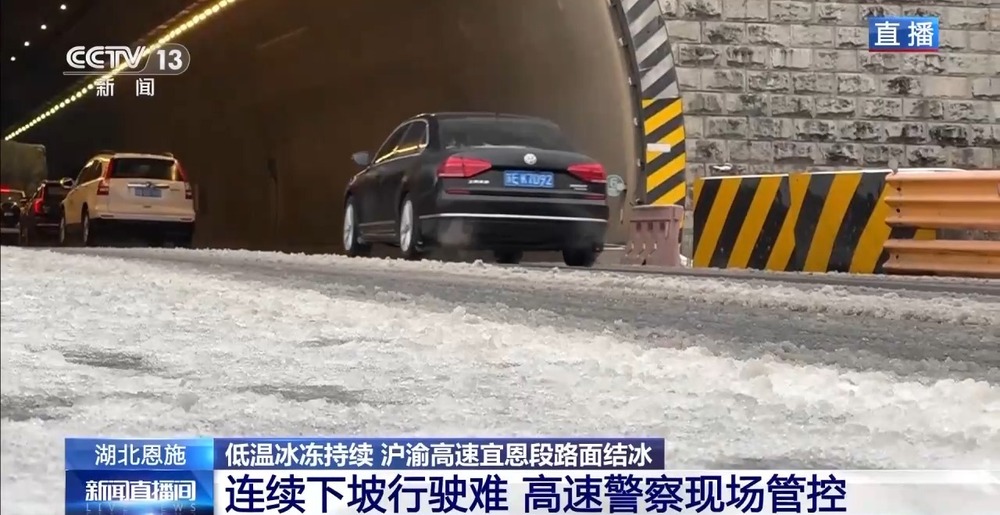 目前,高速公路的地面仍有冰雪覆盖,路上车辆都在缓慢通行。在上坡路段和隧道口前,都有交警在现场指挥。
