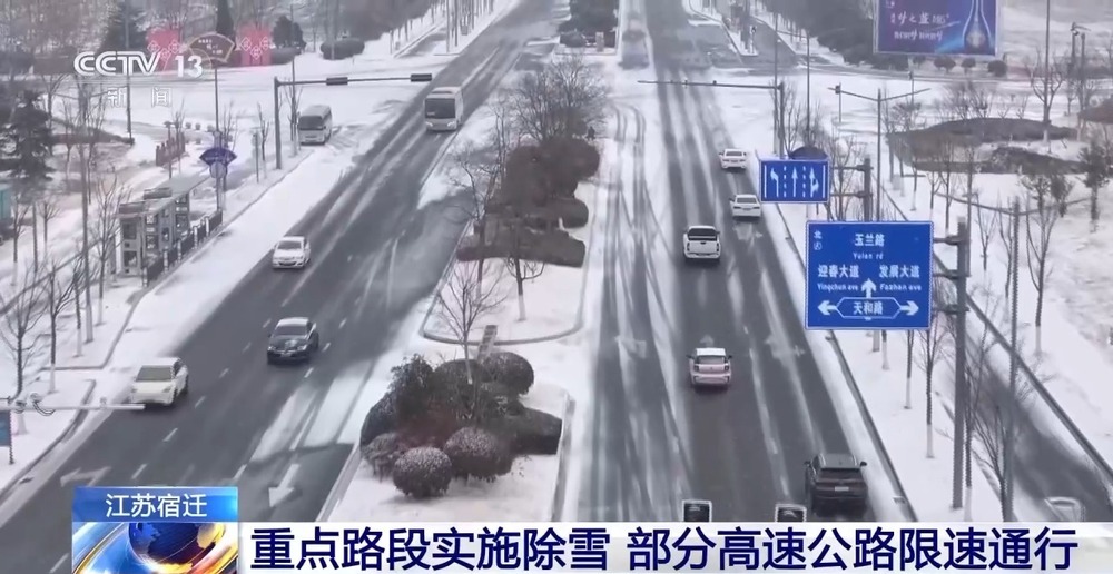 在江苏宿迁,当地组织人员对国省干道、桥梁、陡坡等重点路段实施了机械化除雪作业,并对部分受影响的高速公路实行限速措施,保障大家出行安全。