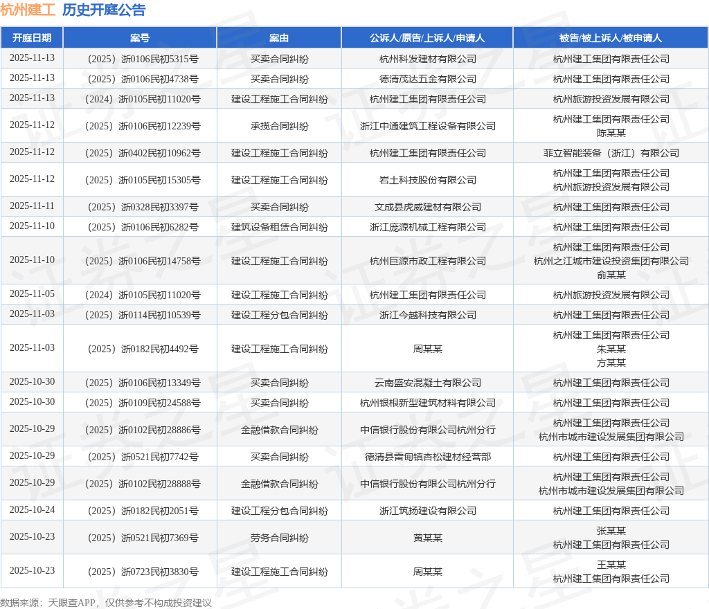 依据计算,近一年内以杭州建工集团有限责任公司为当事人的前史开庭公告有239则,其间案由为“生意合同纠纷”的公告以76则居首,其次为“建造工程项目施工合同纠纷”有44则,“建造工程分包合同纠纷”有25则。前史开庭公告(前20条)如下: