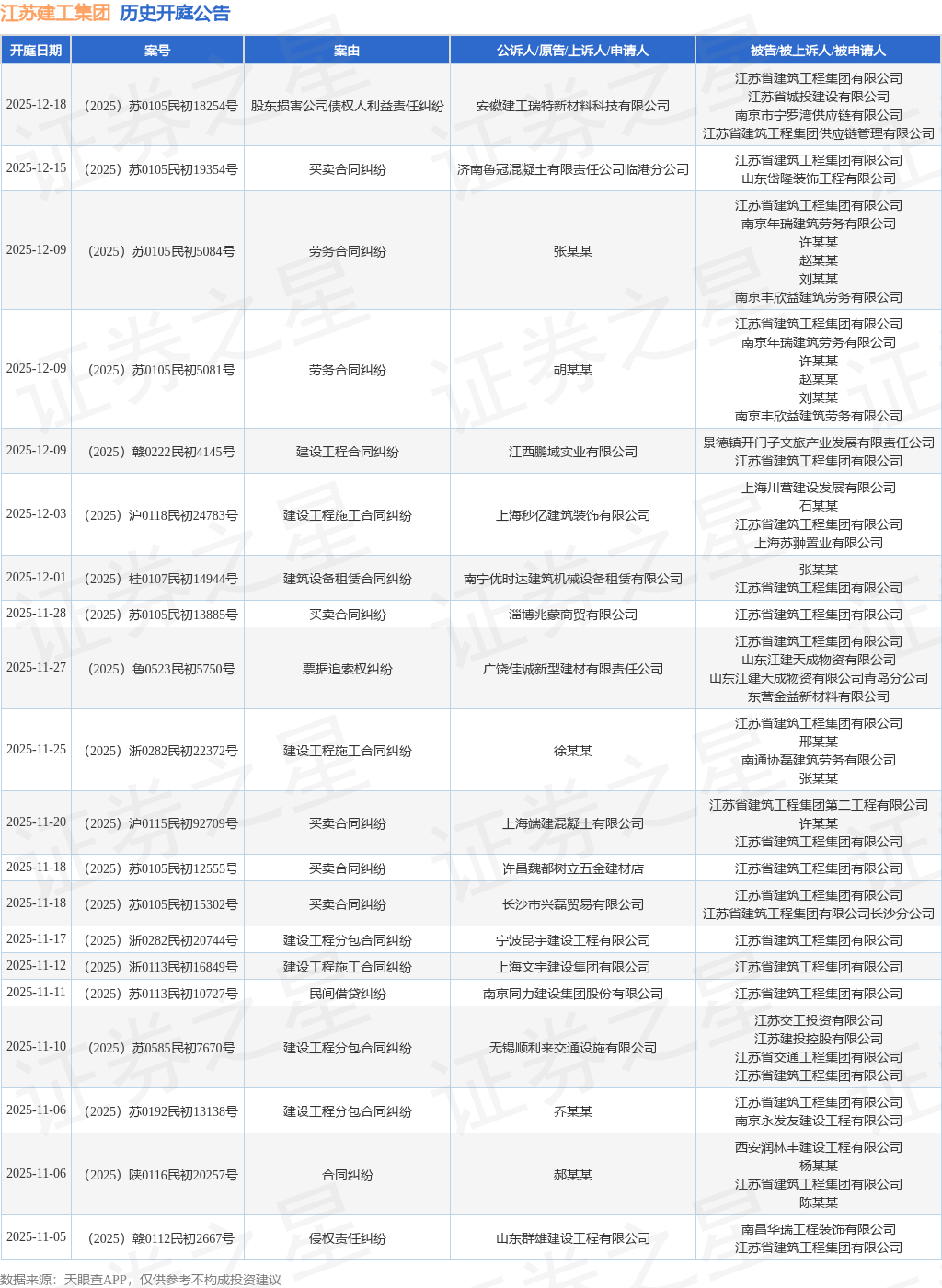 依据计算,近一年内以江苏省建筑工程集团有限公司为当事人的前史开庭公告有910则,其间案由为“生意合同纠纷”的公告以198则居首,其次为“建造工程项目施工合同纠纷”有144则,“建造工程分包合同纠纷”有121则。前史开庭公告(前20条)如下: