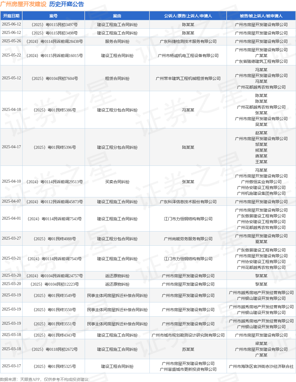 依据计算,近一年内以广州市房子开发建造有限公司为当事人的前史开庭公告有113则,其间案由为“生意合同纠纷”的公告以28则居首,其次为“建造工程项目施工合同纠纷”有25则,“劳务合同纠纷”有10则。前史开庭公告(前20条)如下: