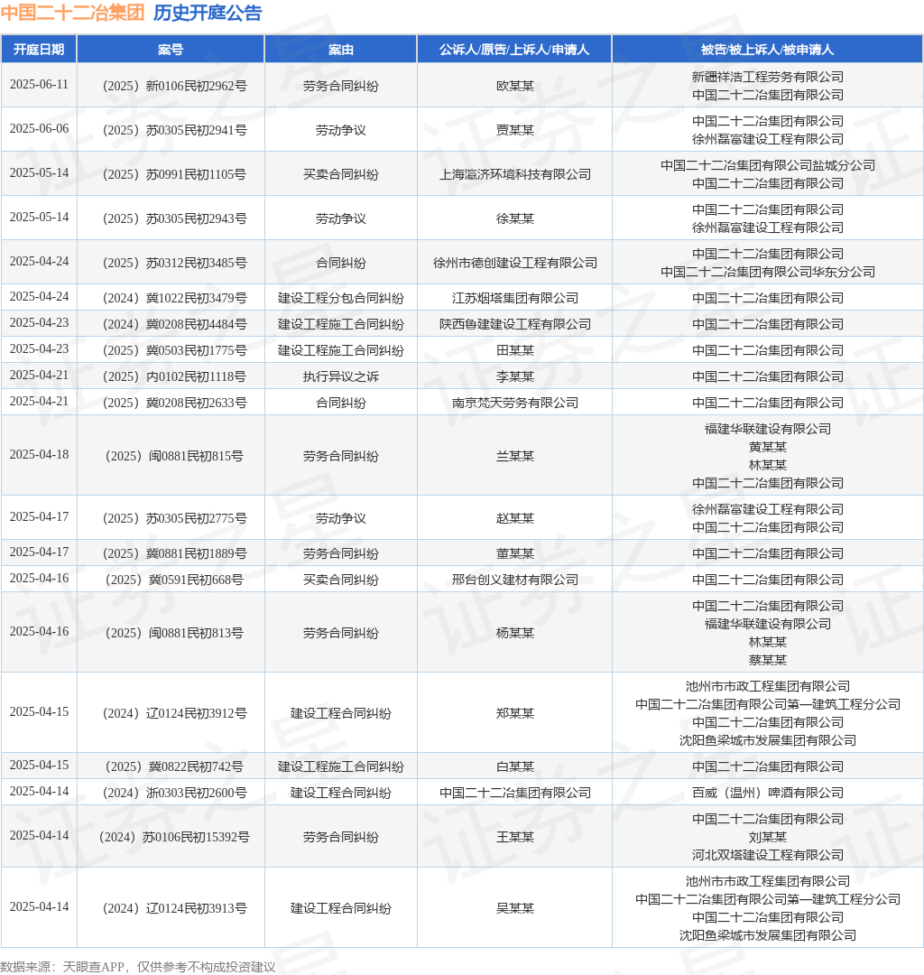 依据计算,近一年内以我国二十二冶集团有限公司为当事人的前史开庭公告有314则,其间案由为“建造工程项目施工合同纠纷”的公告以84则居首,其次为“劳务合同纠纷”有40则,“生意合同纠纷”有39则。前史开庭公告(前20条)如下: